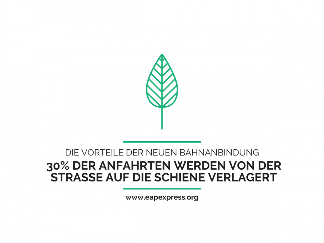 Mit der neuen Bahnanbindung ist ein grosses Verlagerungspotenzial verbunden: Über 30 Prozent der Anfahrten über die Strasse werden neu per Bahn erfolgen. Dies entspricht einer jährlichen Reduktion von 1440 Tonnen CO2 bzw. 5,7 Millionen Autokilometern.